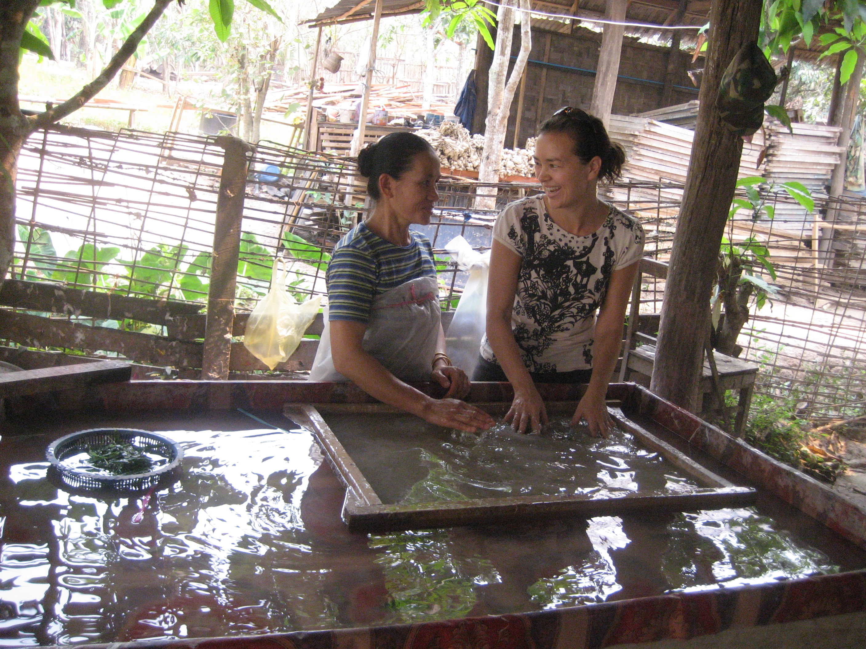 Annie making paper (well, my hands are in pulpy water – she is making paper!)